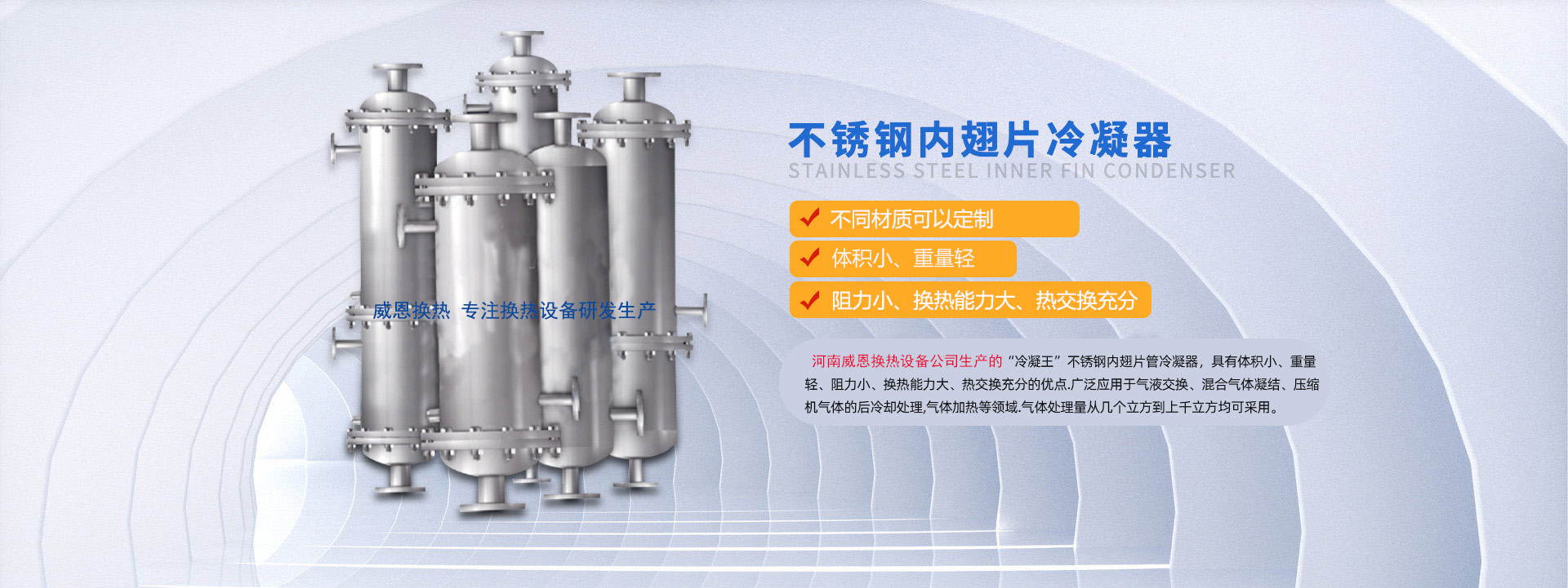 河南威恩換熱設(shè)備有限公司是一家專業(yè)生產(chǎn)制造螺旋板式換熱器、列管式換熱器、節(jié)能換熱設(shè)備的廠家,集科研、設(shè)計(jì)、生產(chǎn)、銷(xiāo)售、工程安裝、調(diào)試為一體的技術(shù)型企業(yè)。公司成立以來(lái)一直致力于節(jié)能環(huán)保換熱設(shè)備的研發(fā)生產(chǎn),主要產(chǎn)品包括螺旋板換熱器、列管式換熱器、內(nèi)翅片冷凝器以及鋼制儲(chǔ)罐、反應(yīng)釜等的研發(fā)設(shè)計(jì)與銷(xiāo)售。公司研發(fā)生產(chǎn)的螺旋板式換熱器,傳熱效率高、可靠性高、阻力小、不易堵塞、可有效回收低品位熱能,已經(jīng)廣泛應(yīng)用到化學(xué)、石油、溶劑、醫(yī)藥、食品、輕工、紡織、冶金、軋鋼、焦化等行業(yè),取得了良好的效果,得到顧客的廣泛認(rèn)可和一致好評(píng)。針對(duì)制藥行業(yè),本公司生產(chǎn)的新型不銹鋼內(nèi)翅片換熱... 【了解更多】